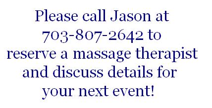 Call Jason today at 703-807-2642 to arrange to have chair massages for your next event! You can also email me at Massage_By_Jason@yahoo.com. Just be sure to mention you found me on ChairMassage4U.com!